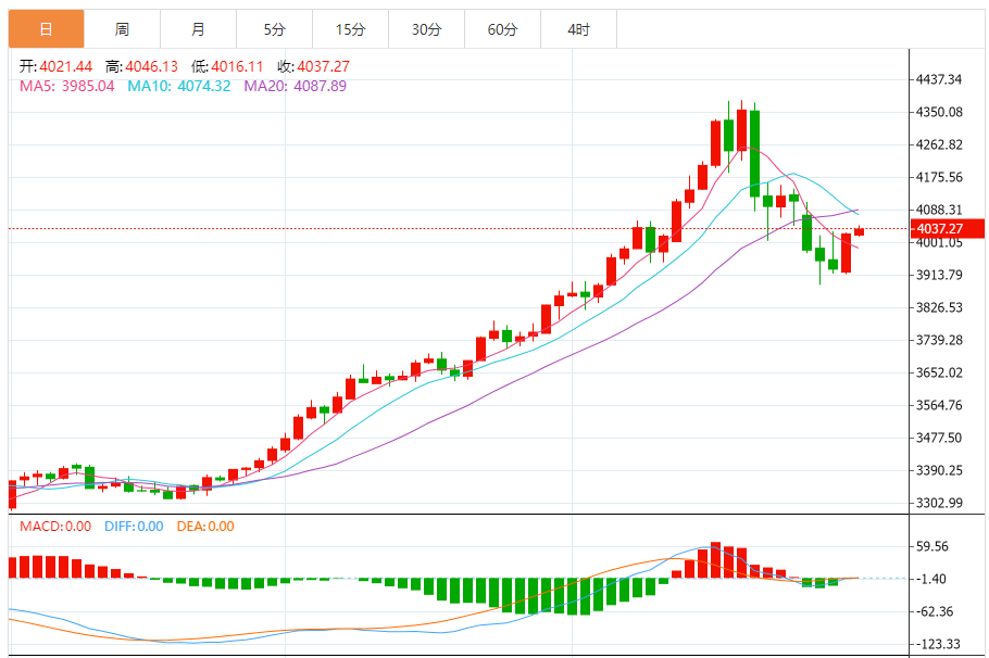 日线图呈现关键反转形态:金价在触及4019美元(近一周低点)后快速回弹,形成“长下影阳线”,且收盘价站稳5日均线(4028美元)上方,验证了4000-4020美元区间的强支撑有效性。技术指标同步改善:MACD指标在零轴上方维持金叉状态,红柱虽略有缩窄但仍保持放量趋势,DIF线(5.43)与DEA线(1.09)间距未进一步收敛,显示多头动能尚未衰竭。RSI指标从昨日的42回升至51,脱离中性偏空区域,转向多头主导区间。