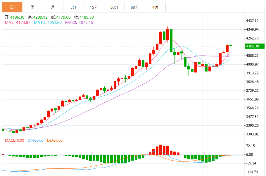 国际现货黄金在美盘时段强势上涨,日内涨近100美元并一度重回4200关口上方,但未能站稳此处,截至目前,黄金报价4185.89。