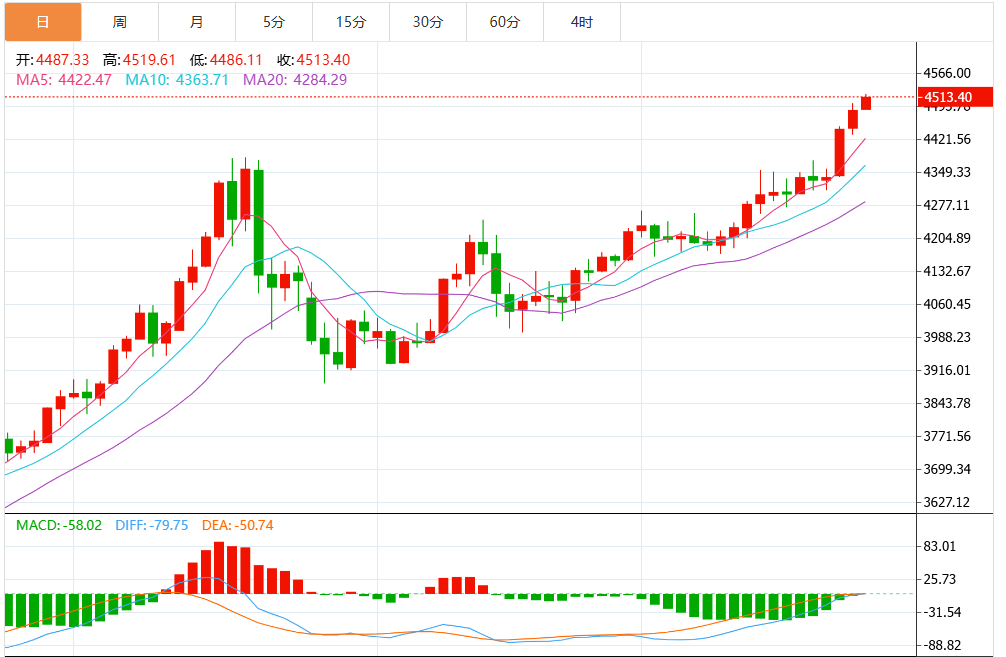绿色蜡烛和持续交易在$4,500心理关口之上可能会使黄金再次冲向$4,550,进而达到$4,600的整数关口。