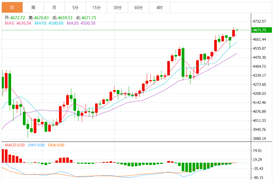 技术形态上,日线级别呈现强势多头结构。黄金价格沿5/10/20日均线多头排列上行,均线系统形成稳固支撑带,5日均线位于4630美元附近,10日均线支撑上移至4600美元,有效托举价格重心。昨日K线收出带长上影线的小阳线,反映高位多空分歧加剧,冲高至4690美元后遭遇获利盘抛售,但下方承接力充足,未跌破短期均线支撑。4小时线显示,价格在突破前高后进入窄幅震荡,量能逐步萎缩,MACD指标维持金叉形态但红柱略有缩短,多头动能边际衰减但未衰竭。