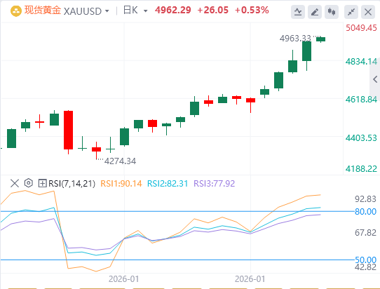 黄金将创历史新高,预计每周涨幅超过7%。在委内瑞拉、伊朗和格陵兰局势紧张后,交易者纷纷涌向传统的避险资产,如黄金。