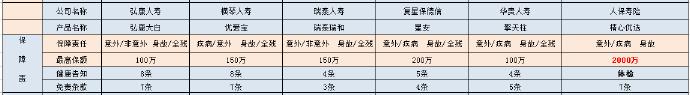 通过上表的对比,擎天柱和瑞泰瑞和的健康告知和免责条款是最少,这对于客户来说,是比较有利的。这几款产品最高保额中,人保精心优选是最高的,但投保是需要体检的,对于健康状况好,而又需要高保额的客户,是比较好的选择。余下的产品最高基本在100-200万左右。