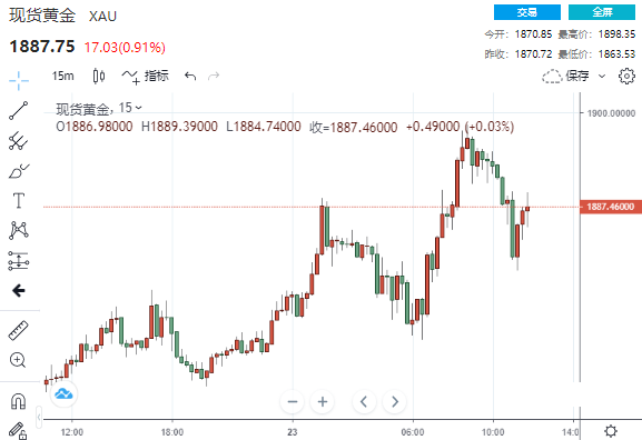 现货黄金回落至1880美元/盎司下方,较日高回落近20美元,日内涨幅收窄至0.5%。现货白银日内跌超3%,现报22.24美元/盎司。