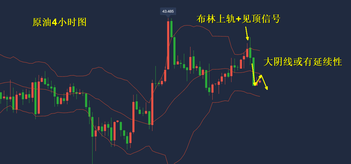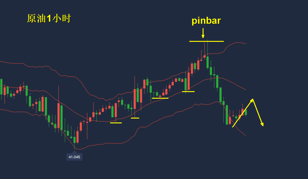 而从一小时图上,前期原油在布林线中轨与上轨之间运动,是较强的多头信号,但随后出现高位pinbar见顶并突破布林线中轨,空头力量显示较强,行情日内如果回抽测试布林线中轨出现见顶信号,这是比较优质的看空机会。