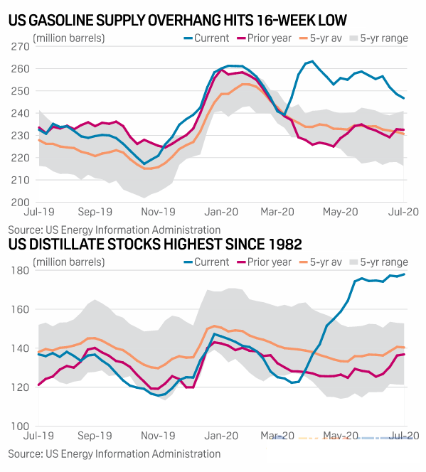 馏分油需求的回落推高库存107万桶,至1.788亿桶。馏分油库存上一次上涨是在1982年12月。但上周汽油库存下降180万桶,至2.4673亿桶,仅比五年平均水平高6.9%,4月中旬时的水平为12.6%。