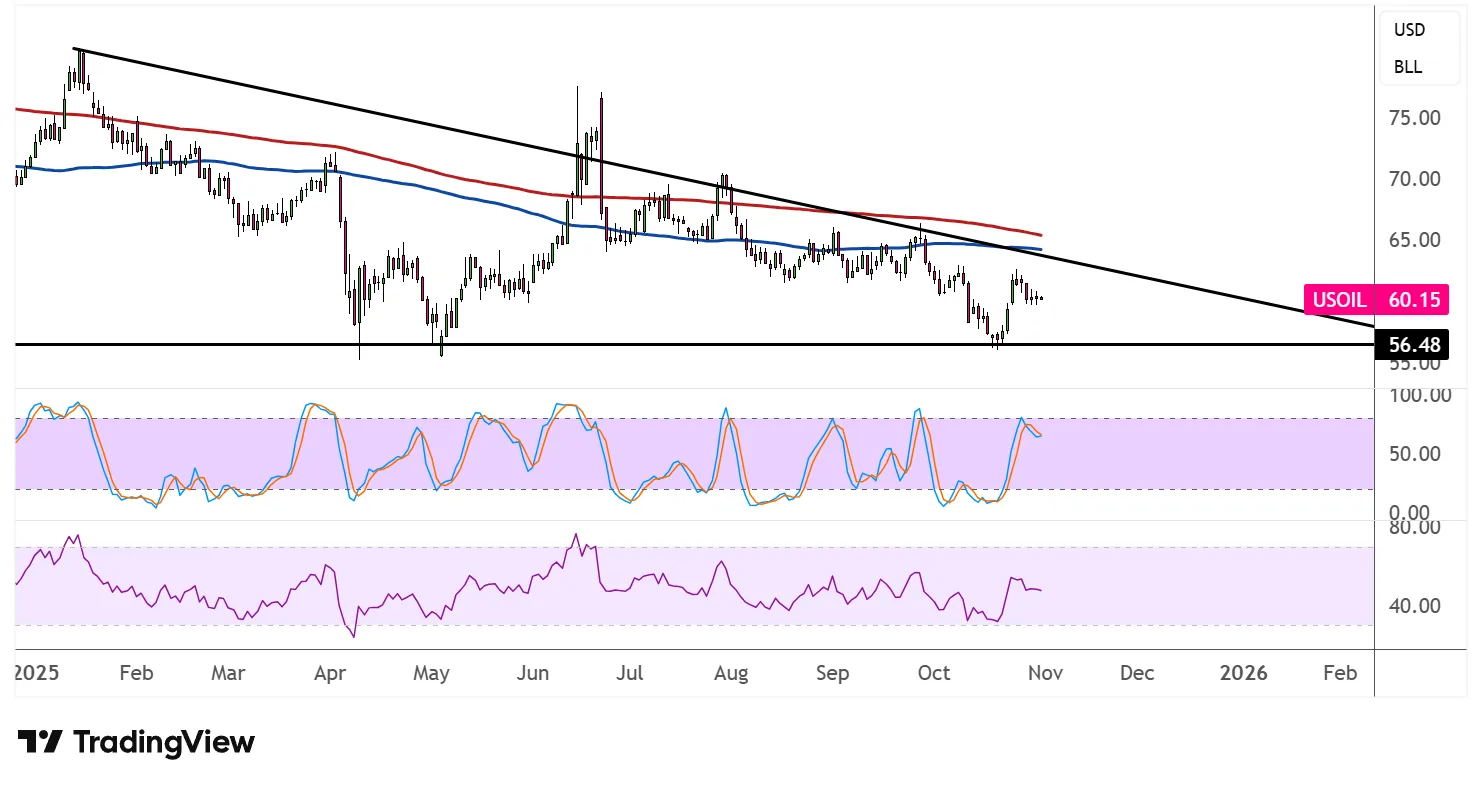 图表模式显示了一系列由下降趋势线连接的较低高点,而56.00-56.50美元区域一直是相对水平的支撑位。