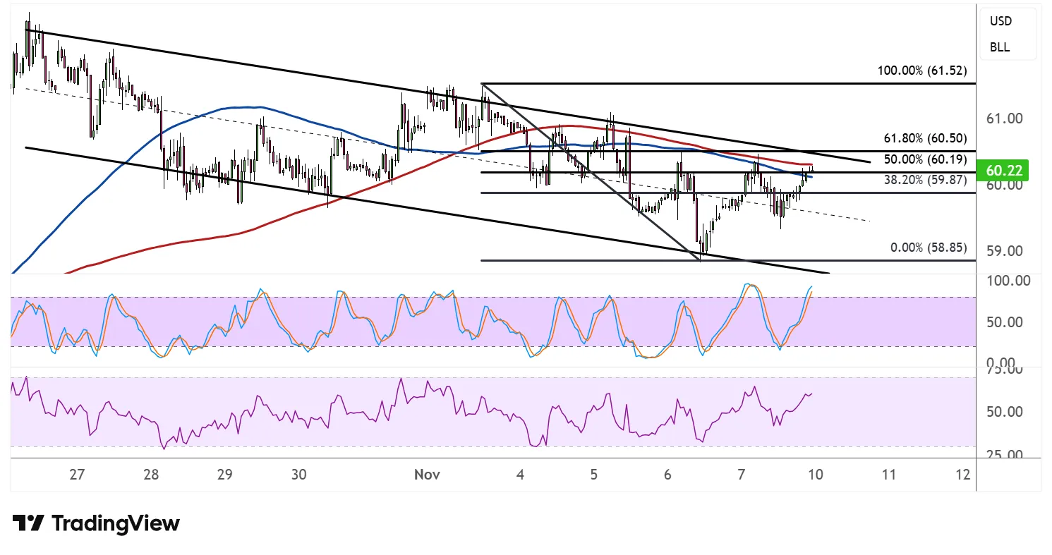该感兴趣区域与38.2%和50%斐波那契回撤位分别为59.87美元和60.19美元重合,该回撤位是从最新的波动高点跌至58.85美元附近的低点。这些技术融合可能足以控制涨幅并刺激抛售压力的回归。