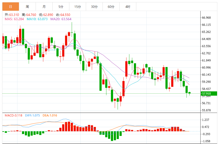 周一(11月24日),美原油价格交投于57.900美元/桶附近,跌幅为0.28%。