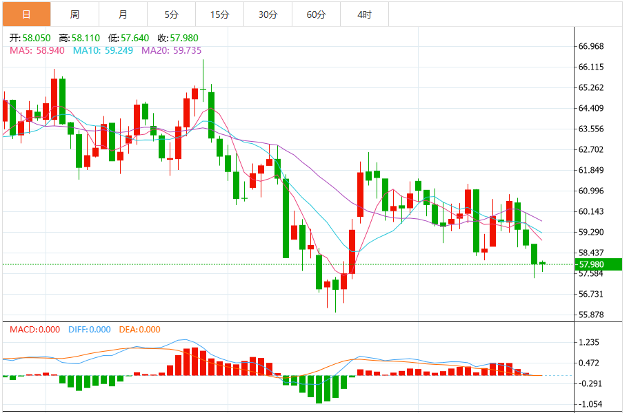 价格在57.60—58.20美元区间反复获得支撑,显示买盘存在一定承接,但若该区域被有效跌破,短线恐将向56美元一线延伸。而若油价能够重新站上59.80美元上方并实现有效收盘,则有机会触发技术性反弹,进一步挑战61美元附近的密集压力带。