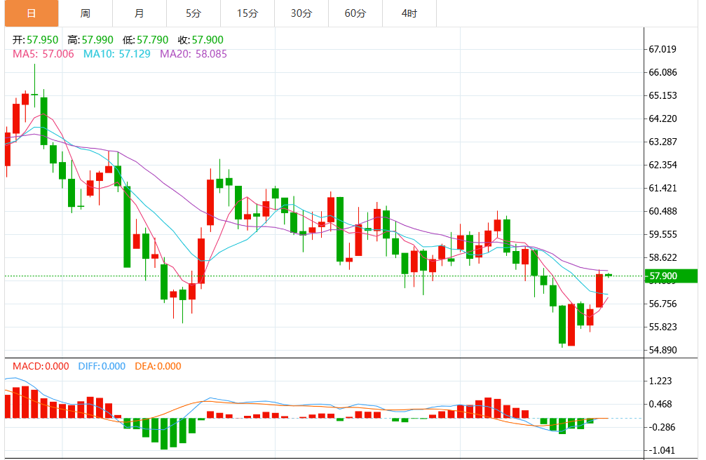 在技术面上,美原油日线走势仍处于弱势修复阶段。从形态看,价格在此前快速下跌后于57.8–58.0美元区域形成阶段性支撑,近期连续收出小阳线,显示低位买盘开始介入,但反弹力度仍偏温和。