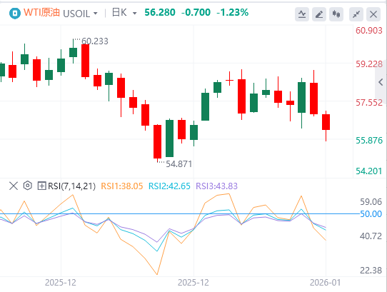 原油跌至自12月19日以来的最低水平,约在55.70-55.65美元区间,似乎面临进一步下跌的风险。截至目前,WTI原油报价56.28美元,Brent原油报价60.22美元。