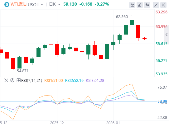 当前WTI原油价格正面临62美元水平的压制,需有效突破此水平,方能打开上探66美元区域的空间。然而,交易环境正日趋复杂:除经济增长、通胀、AI基建及债务等长期宏观主题外,从委内瑞拉、格陵兰到伊朗的地缘政治热点频发,令市场解读与定价难度加大。