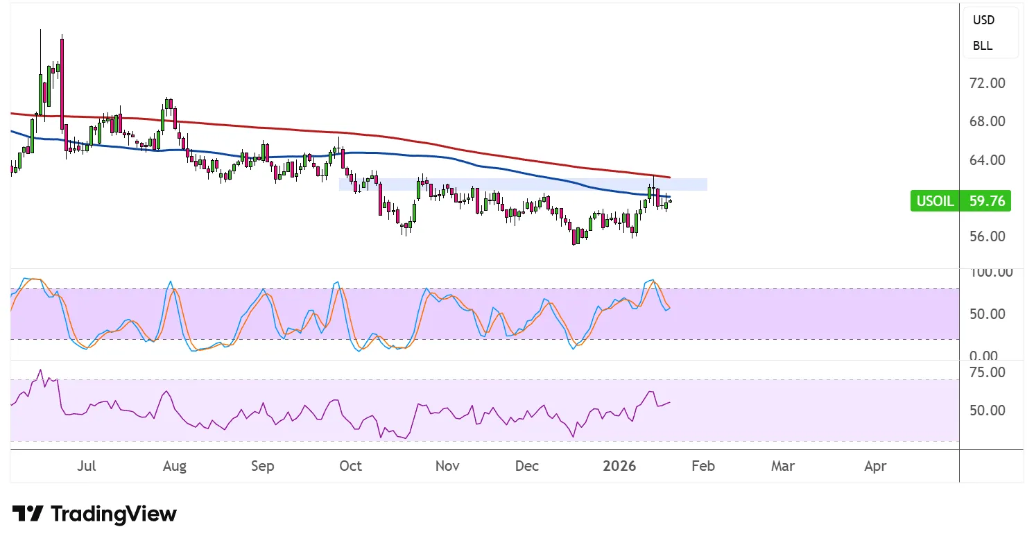 该商品目前在62.00美元区域附近测试阻力,该区域与双底形成的颈线重合。若持续突破该水平,将确认多头反转形态,并可能触发相当于该形态高点的上行,目标可能达到每桶68.00美元或更高区间。