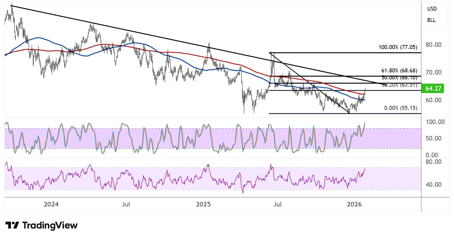 价格目前交易价约为每桶64.27美元,似乎有望挑战自2024年初以来限制反弹的长期下降趋势线。