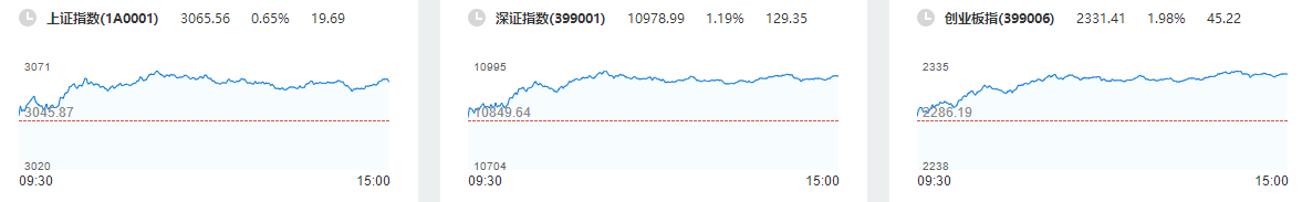 12月26日下午,A股收市,三大指数高开高走,震荡上行,上证指数收涨0.65%,停止7连跌,深证成指收涨1.19%,创业板指收涨1.98%。当天,两市成交额约6243亿元,较上一交易日放量389亿元;北向资金净买入超28亿元,大盘资金净流出超50亿元。