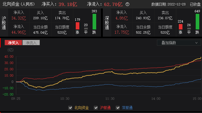 12月28日,沪指盘中震荡回升,午后再度回落翻绿;上证50指数逆市上扬;深成指、创业板指弱势震荡下探,午后跌近1%;两市成交约6500亿元,北向资金尾盘加速进场,全天净买入近40亿元。