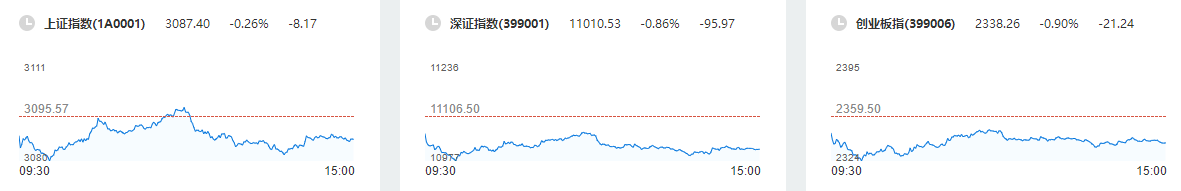 截至收盘,沪指跌0.26%报3087.4点,深成指跌0.86%报11010.53点,创业板指跌0.9%报2338.26点,上证50指数涨0.22%;两市合计成交6508亿元,北向资金净买入39.18亿元。盘面上看,电力、旅游板块强势拉升,银行、保险、酒店餐饮、医疗保健等板块均上扬;仿制药、绿色电力、风电概念逆市活跃;物流、汽车、农业、纺织服装、酿酒、软件、半导体等板块下挫。