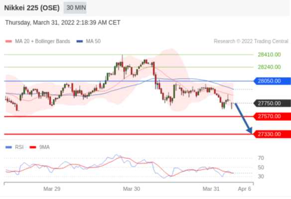 在 28050.00 之下,看跌,目标价位为 27570.00 ,然后为 27330.00 。
