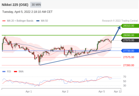 交易策略: 在 27730.00 之上,看涨,目标价位为 28090.00 ,然后为 28310.00 。