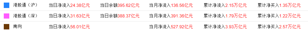 今日,南向资金合计净买入40.01亿港元。其中,港股通(沪)净买入16.1亿港元,港股通(深)净买入23.91亿港元。