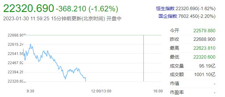 1月30日,今日早盘,恒指低开低走,截至午盘,恒指跌1.62%,报22320.6点,恒生科技指数跌2.73%,平安好医生跌超6%领跌。