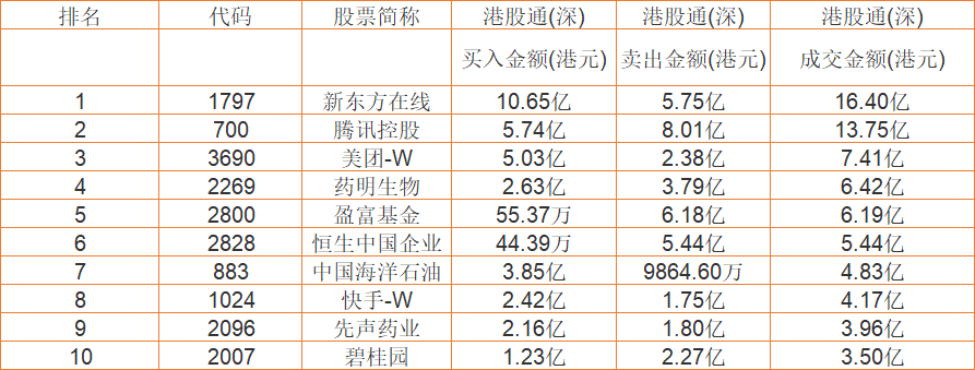 港股通(深)买卖前十股(单位:港元):