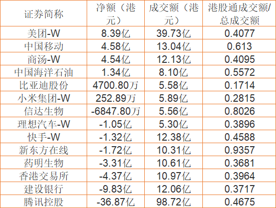 亚汇网1月30日港股通数据统计显示:美团-W净买入额居首,达8.39亿港元,腾讯控股净卖出额居第一位。(亚汇网编辑:陌尘)