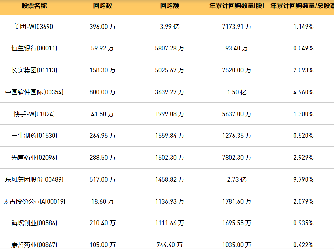 4月16日港股回购概况:摩比发展(00947)、旭辉永升服务(01995)、东风集团股份(00489)、永安国际(00289)、清科创业(01945)、亚洲金融(00662)、东亚银行(00023)、联易融科技-W(09959)、创维集团(00751)、中石化炼化工程(02386)、天福(06868)、未来发展控股(01259)、友邦保险(01299)、数码通电讯(00315)、信星集团(01170)、太古股份公司A(00019)、亿都(国际控股)(00259)、中国软件国际(00354)、固生堂(02273)、三生制药(01530)、太古股份公司B(00087)、先声药业(02096)、周黑鸭(01458)、万物云(02602)、瑞尔集团(06639)、天鸽互动(01980)、旭日企业(00393)、九方财富(09636)、复星国际(00656)、海螺创业(00586)、恒生银行(00011)、快手-W(01024)、天工国际(00826)、永达汽车(03669)、顺丰同城(09699)、康哲药业(00867)、美团-W(03690)、医渡科技(02158)、雍禾医疗(02279)、长实集团(01113)、康圣环球(09960)、和誉-B(02256)、途虎-W(09690)于2024年4月15日进行了回购。其中,回购金额最大的为美团-W(03690),回购数量396.00 万,回购金额3.99 亿元。