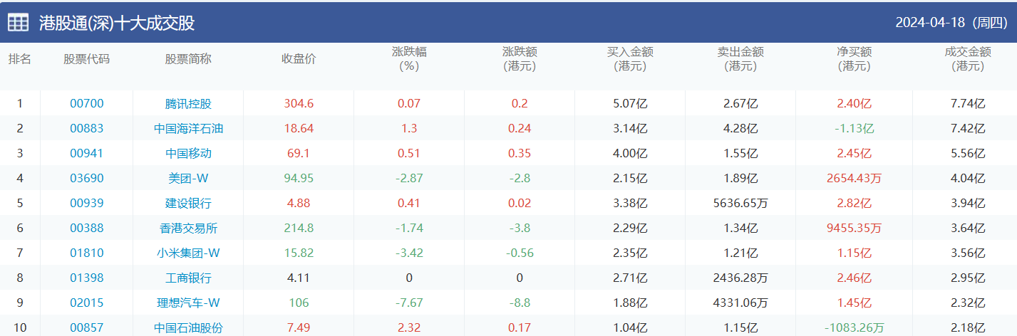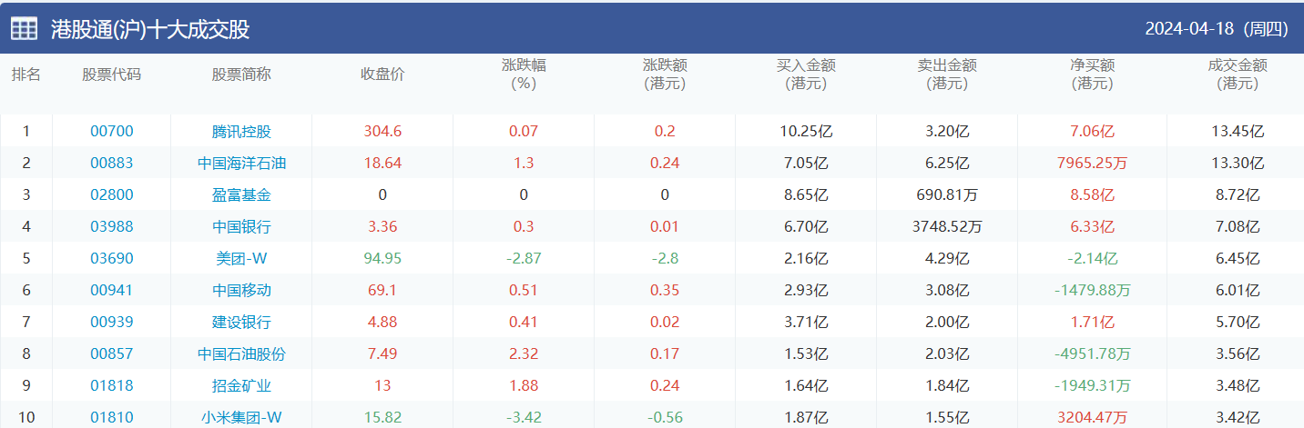亚汇网实时数据统计:截至4月19日收盘腾讯控股、中国海洋石油、盈富基金位居港股通(沪)成交前三,腾讯控股、中国海洋石油、中国移动居股通(深)成交前三。