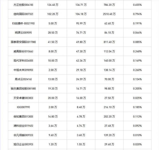 方正控股(00418)、摩比发展(00947)、安德利果汁(02218)、俊知集团(01300)、现代牙科(03600)、太平洋航运(02343)、国泰君安国际(01788)、中远海发(02866)、天福(06868)、信利国际(00732)、威高股份(01066)、归创通桥-B(02190)、碧桂园服务(06098)、天安卓健(00383)、思派健康(00314)、清科创业(01945)、美高梅中国(02282)、友邦保险(01299)、创科实业(00669)、腾讯控股(00700)、非凡领越(00933)、名创优品(09896)、中旭未来(09890)、明源云(00909)、玄武云(02392)、康臣药业(01681)、旭日企业(00393)、IGG(00799)、周黑鸭(01458)、骏杰集团控股(08188)、中国东方航空股份(00670)、一脉阳光(N23020)、中国恒有源集团(08128)、易点云(02416)、中国旭阳集团(01907)于2025年6月18日进行了回购。其中,回购金额最大的为腾讯控股(00700),回购数量99.00 万,回购金额5.01 亿元。