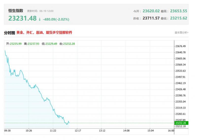 上午盘面: 中东局势持续升级,美国据悉可能在24小时内攻击伊朗。港股上午盘三大指数低开低走表现十分弱势,截止午盘,恒生指数跌2.02%下挫近500点,国企指数、恒生科技指数分别下跌2.12%及2.38%,市场情绪十分低迷。盘面上,大型科技股、大金融股、中字头股等权重全线下跌,京东跌近4%,美团跌3%,中信证券、中