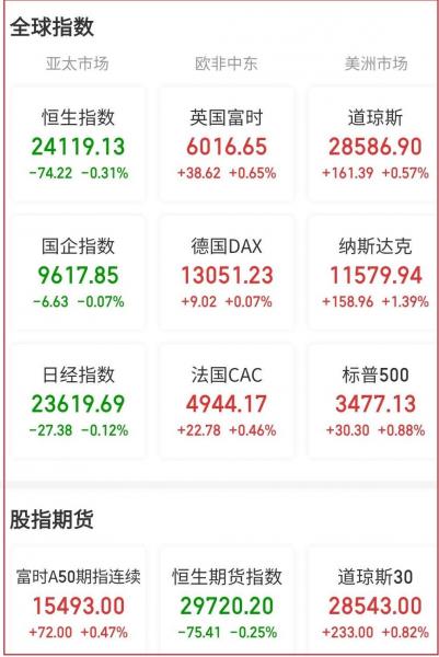 在欧洲各国股市中,德国DAX 30指数收涨2.85%,报收于13051.23点;英国富时100指数收涨1.94%,报收于6016.65点;法国CAC 40指数收涨2.94%,报收于4944.17点。与此同时,意大利富时MIB指数收涨2.82%,报收于19597.50点。
