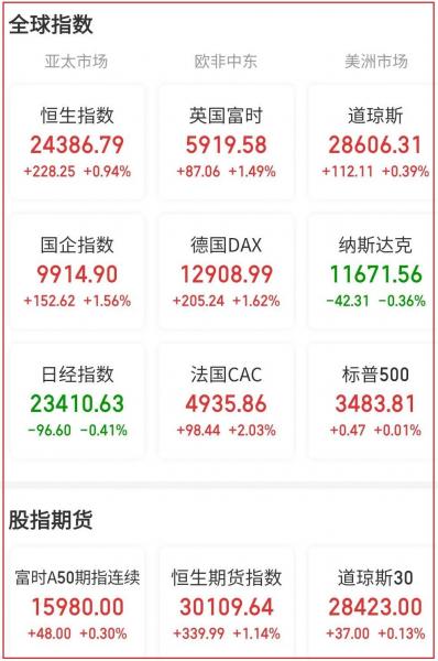 亚太股市方面,日经225指数跌0.41%,收于23410.63点,全周收跌0.89%。韩国KOSPI指数收跌0.83%,收于2341.43点,全周收跌2.11%。澳大利亚指数收跌0.46%,收于6385.00点,全周收涨1.15%。