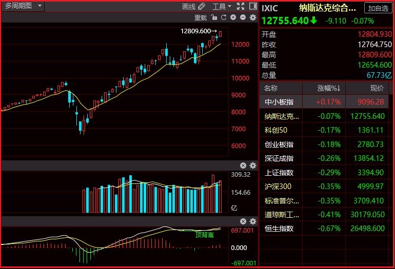 美东时间周五,美股三大指数小幅收跌。截止收盘,道指收跌124.32点,跌幅0.41%,报30179.05点;纳指收跌9.11点,跌幅0.07%,报12755.64点;标普500指数收跌13.07点,跌幅0.35%,报3709.41点。
