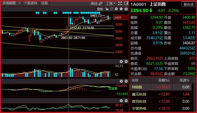技术上创业板指数日线周期收小阴线,上证日线周期收小阴线,小时周期MACD指标快慢线零轴下方金叉张口,红色量能柱放量,15分钟周期MACD指标快慢线零轴上方死叉张口,绿色量能柱放量,5分钟周期延续运行平台形整理,成交量较上日小幅放量。