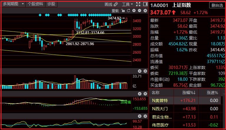 技术上创业板指数日线周期收中阳线,上证日线周期收中阳线,小时周期MACD指标快慢线零轴上方金叉张口,红色量能柱放量,15分钟周期MACD指标快慢线零轴上方金叉张口,红色量能柱放量,5分钟周期延续运行新的子浪上涨,成交量较上日小幅放量。