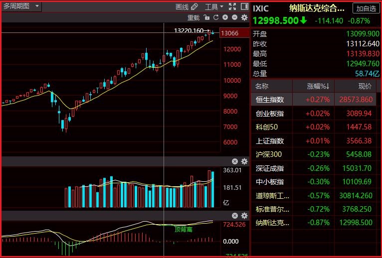 美东时间周五,美股三大指数集体收跌,银行、新能源汽车等板块走低。截止收盘,道指收跌177.26点,跌幅0.57%,报30814.26点;纳指收跌114.14点,跌幅0.87%,报12998.50点;标普500指数收跌27.29点,跌幅0.72%,报3768.25点。交易方面,因1月18日(下周一)为美国“马丁路德金纪念日”,美股将休市一天,1月19日(下周二)恢复正常交易。