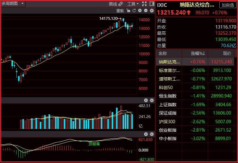 美东时间周五,美股收盘走势分化,道指跌0.71%,纳指涨0.76%,标普500指数微跌。盘面上,大型科技股、航运、油气、新能源汽车、区块链股普遍反弹;银行股全线走低。截止收盘,道琼斯工业指数跌234.33点,跌幅0.71%,报32627.97点;纳斯达克指数涨99.07点,涨幅0.76%,报13215.24点;标普500指数跌2.36点,跌幅0.06%,报3913.10点。