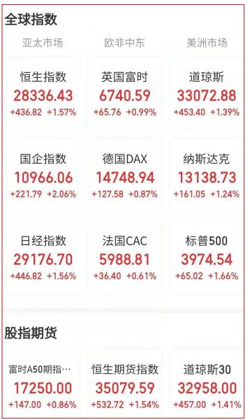 在欧洲各国股市中,德国DAX 30指数收涨0.88%,报收于14748.94点;英国富时100指数收涨0.48%,报收于6740.59点;法国CAC 40指数收跌0.15%,报收于5988.81点。与此同时,意大利富时MIB指数收涨0.80%,报收于24393.26点。