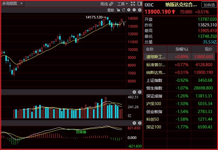 美东时间周五,美股三大指数延续涨势,道指、标普500指数齐创收盘历史新高。盘面上,大型科技股、银行股多数收涨,区块链概念股、航运股、油气股普跌,芯片涨跌各异。截止收盘,道琼斯工业指数涨297.03点,涨幅0.89%,报33800.60点;纳斯达克指数涨70.88点,涨幅0.51%,报13900.19点;标普500指数涨31.63点,涨幅0.77%,报4128.80点。