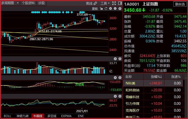 1.日K线失守牛熊线,从运行的动能来看,多空力量显示空方占优;
