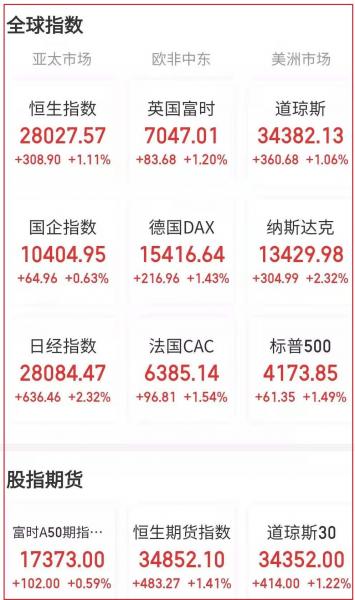 美东时间周五,美国三大股指集体收涨,纳指涨超2%,道指、标普500指数涨逾1%。盘面上,美国科技、银行股集体上涨,热门中概股普涨。道琼斯工业指数涨360.68点,涨幅1.06%,报34382.13点;纳斯达克指数涨304.99点,涨幅2.32%,报13429.98点;标普500指数涨61.35点,涨幅1.49%,报4173.85点。