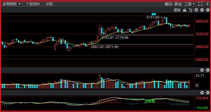 3.周线MACD指标显示空头状态,绿柱扩张限制,RSI显示50上方金叉状态,周线收一中阳线。