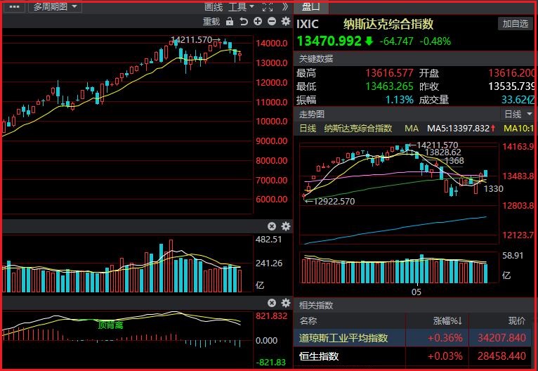 美东时间周五,美股三大股指涨跌不一,标普500指数自2月来首次周线二连跌。盘面上,大型科技、区块链、疫苗、航运股普跌,银行、能源股多数收涨,芯片股涨跌各异。截止收盘,道指涨0.36%,报34207.84点,标普500指数跌0.08%,报4155.86点,纳指跌0.48%,报13470.99点。