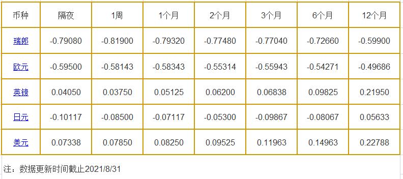 1周LIBOR: 瑞郎报-0.81900%,欧元报-0.58143%,英镑报0.03750%,日元报-0.08500%,美元报0.07850%;