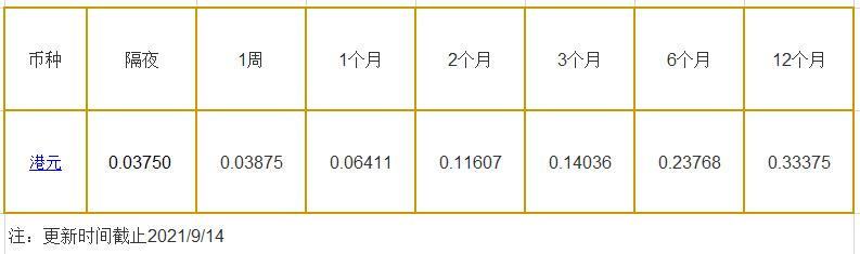 9月14日香港银行间同业拆借利率港币: