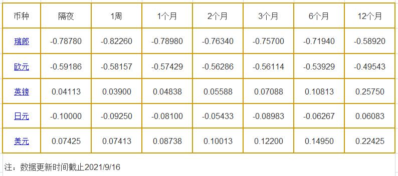 1周LIBOR: 瑞郎报-0.82260%,欧元报-0.58157%,英镑报0.03900%,日元报-0.09250%,美元报0.07413%;