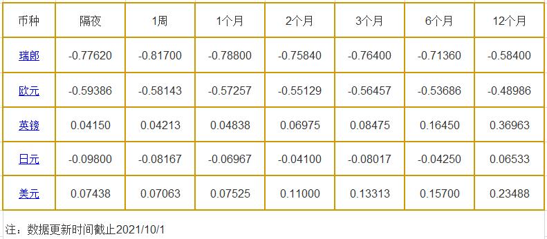 1个月LIBOR:瑞郎报-0.78800%,欧元报-0.57257%,英镑报0.04838%,日元报0.07525%,美元报0.08025%。