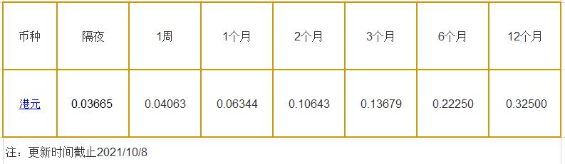 10月8日香港银行间同业拆借利率港币:
