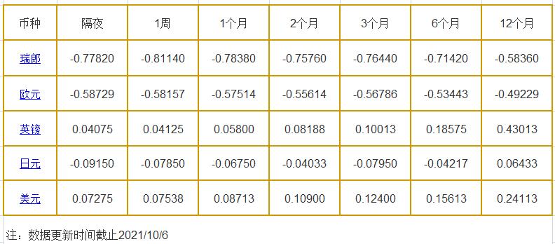 1个月LIBOR:瑞郎报-0.78380%,欧元报-0.57514%,英镑报0.05800%,日元报-0.06750%,美元报0.08713%。